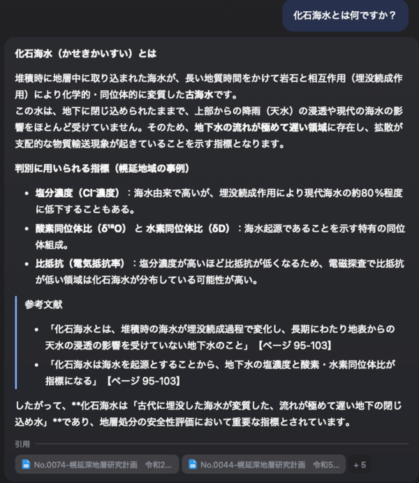 試験運用の一例として、「化石海水とは何ですか?」という問いに対する構築したRAGシステムの回答例を図4に示します。問いに対し、RAGシステムがDB上の原子力機構の研究成果を検索し、LLMが検索結果を用いて対話形式で回答している様子がわかります。回答の内容は一般的な内容ではなく、高レベル放射性廃棄物の地層処分に関連した文脈となっており、引用文献が付されていることがわかります。