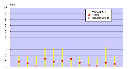 過去5年間(2020年度〜2024年度)に日本原子力研究開発機構が測定した結果のうち、最大値を「平常の変動幅」 としています。
