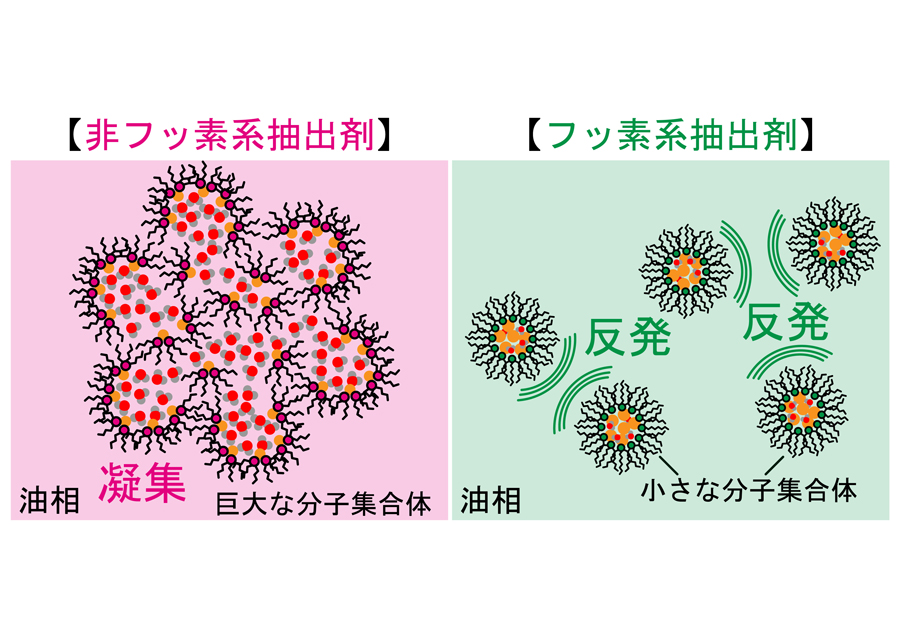 一般に、抽出剤を用いる際は第三相生成を避けるため、回収金属の濃度を意図的に下げ、抽出効率を犠牲にする必要がある。ところが、開発したフッ素系抽出剤は高濃度の金属を抽出させても第三相はできない。高い抽出効率と第三相を生成させないという2つの能力を共存させていたのだ。