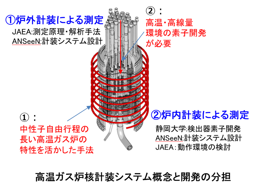 そんな時、高温工学試験研究炉(HTTR)の核計装改良の際、放射線計測機器メーカーのANSeeN(静岡県浜松市)の技術者が、直接発注につながらないような技術的な相談にも親身なってくれたことを思い出した。この縁がつながり、同社と、検出器素子に強い静岡大学電子工学研究所の青木徹教授を迎えた産学官チームが誕生。公募資金(文部科学省の原子力システム研究開発事業)を得たテーマは「炉外検出器システム」で、将来的に1000度の耐熱性獲得を目指す「耐高温炉内検出器」も加えた。