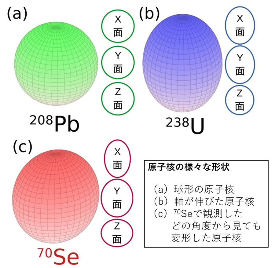 この結果、Se―70は3軸の長さが異なるユニークな形をしていることが分かった。図に例示したように、鉛(Pb―208)のような球形の原子核は、3つのどの方向から見ても円形だ(図(a))。レモン型に変形したウラン(U―238)は1つの軸が長く、この軸から観察したときだけ円形に見える(b)。