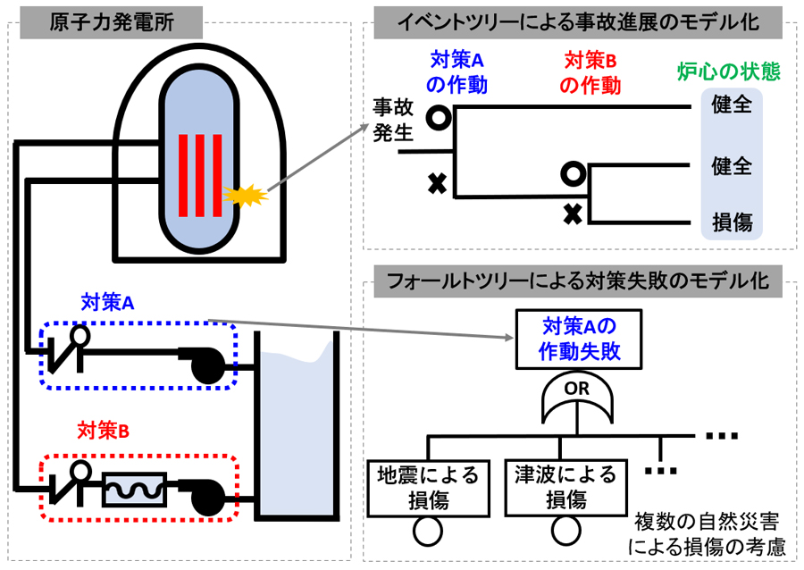 このバランスを取るための手法の一つが「確率論的リスク評価」だ。機器の作動失敗や自然災害による損傷確率をイベントツリーやフォールトツリーと呼ばれる樹形図に整理し、事故の進展や対策の効果をモデル化する。これにより、炉心損傷に至る確率やその際の影響を定量的に評価でき、より効果的な安全対策を検討できる。