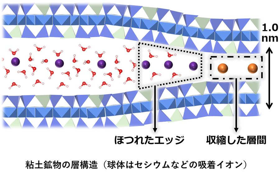 粘土鉱物の層間は水和した陽イオンが吸着した「膨潤な層間」と脱水した陽イオンのみが吸着する「収縮した層間」がある。両者をつなぐのが「ほつれたエッジ」だ。検証の結果、Cs濃度が低い場合は「ほつれたエッジ」にCsが吸着し、濃度上昇につれ「ほつれたエッジ」が移動しながら「収縮した層間」を作る。高濃度では「収縮した層間」が主流となった。