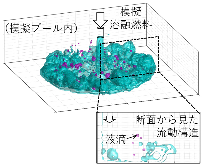 解析の結果、模擬溶融燃料の液滴への分裂は、①二つの液体の速度差や遠心力によって渦状の流れにできた波の先端が引きちぎられる「サーフィンパターン」②底面に落ちて巻き上がった後に重力に引かれ落ちる「液膜破断パターン」――があると分かった。