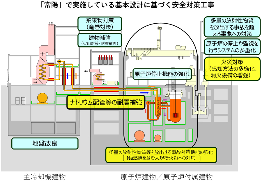 運転再開を目指す「常陽」では、新規制基準に適合するため、共通要因故障をもたらす自然現象や火災などへの対策強化や、設計基準を超える事象への対策を求められている。