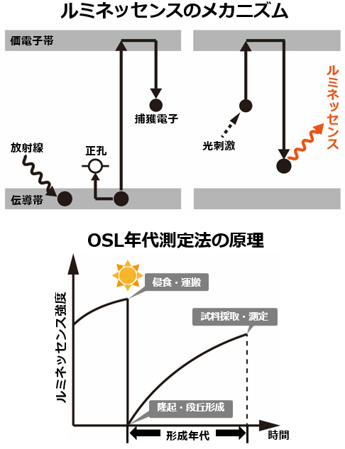 鉱物は自然放射線からのエネルギーを電子の形で蓄え、光を受けると電子を解放して微弱光(ルミネッセンス)を発する。この特性を利用し、鉱物のルミネッセンス強度から被ばく線量を推定。周囲の放射線量率で割ると被ばくからの経過時間、つまり、年代が求められる。太陽光はOSL年代をリセットするので、鉱物が堆積前に露光したと前提すれば、移動が終わって堆積し始めた形成年代が推定できる。現状では形成年代を直接測定できる手法は他になく、海成段丘の編年に極めて有効なのではと考えた。