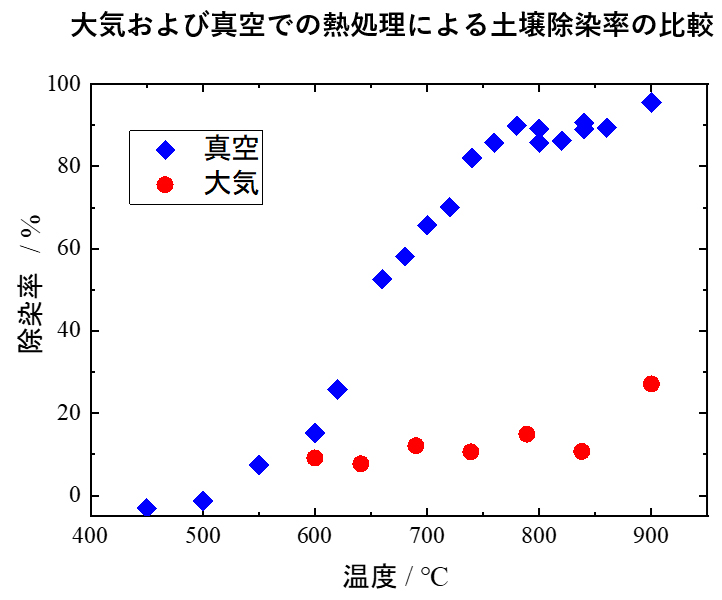 私たちは、除染法の効率化を進める中で条件を見直した。塩化ナトリウム(食塩)を添加剤として土壌に混ぜ、真空中で熱処理を行ったところ、処理温度を約800℃まで下げることに成功した。図に示すように、真空中では600℃付近から除染率が上昇し、800℃を1時間維持すると9割のセシウムが除去される。一方、従来型の大気中での熱処理は、800℃付近で15%程度しか除去されなかった。真空こそが反応を加速させ、除染効率を劇的に高めていたのだ。