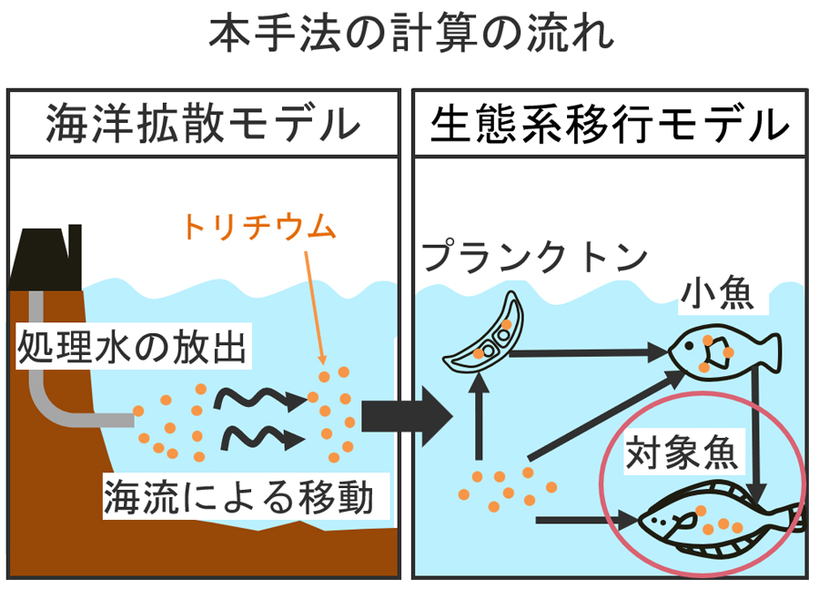 開発した手法は二つのモデルを組み合わせ、海水と海産物の両方を連携して計算し、結果の信頼性を向上させた。海水中トリチウム濃度推定は「海洋拡散モデル」を使い、海流や水温など海況による効果を織り込んだ。その上で、「生態系移行モデル」で海産物中のトリチウム濃度を推定する。海洋生物は体内に①海水から直接②食物連鎖で間接―という2経路で取り込むのを踏まえ、飼育実験の実測値などを用いてモデル精度を上げている。