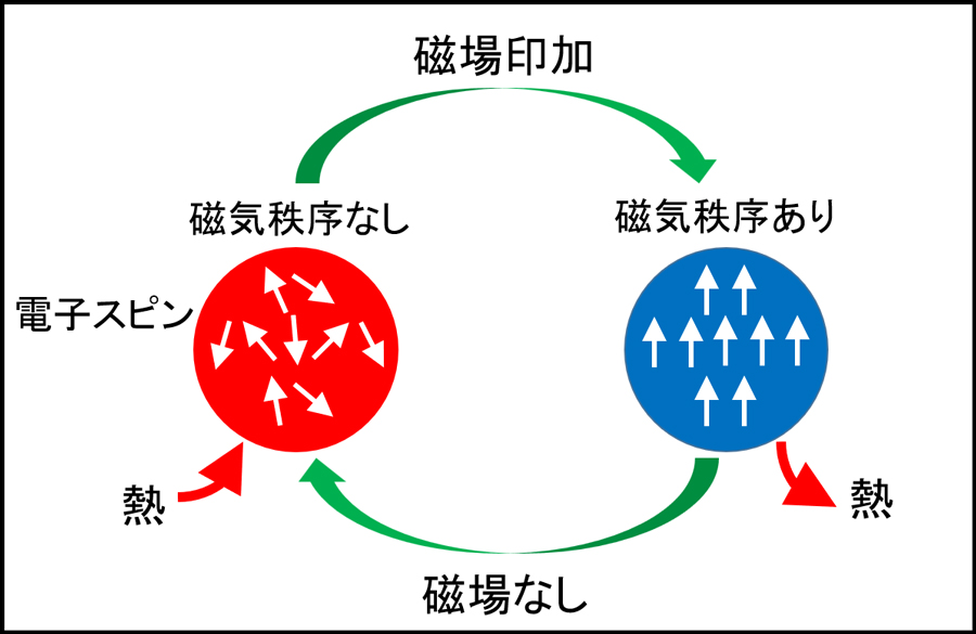 こうした観点から、温暖化の原因となるガス冷媒による冷凍ではなく、固体物質の「熱量効果」を用いた手法が注目されている。熱量効果とは、物質に電場・磁場・圧力などの外場を加えて起きる、物質と外部との熱のやり取りのこと。ガスの圧縮膨張よりも効率の良い冷凍が可能なことから、近年の環境意識の高まりとともに研究が盛んになった。原子力機構でも大学などと連携し、研究を進めている。