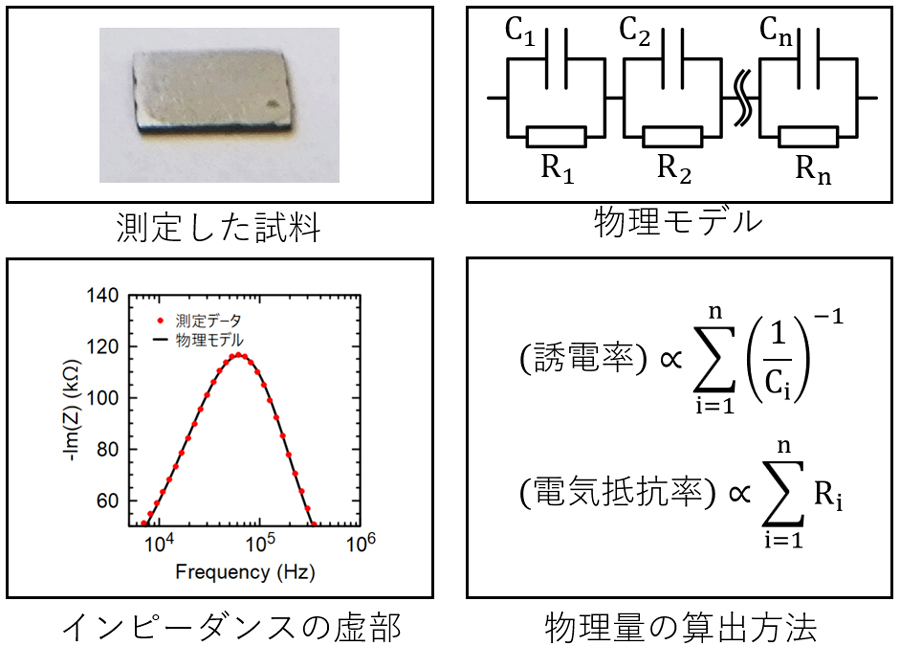そこで私たちは、独自開発した解析手法とインピーダンス(交流の電気抵抗)測定を組み合わせた新たな手法を確立。具体的には不均質性を考慮した「ミクロな物理モデル」から得たインピーダンスを、実測データに当てはめる。物理モデルは「抵抗とコンデンサーの並列回路」が直列に多数つながる電気回路で表現した。この物理モデル選定に時間を要したが、誘電率と電気抵抗率を高精度に評価することができた。