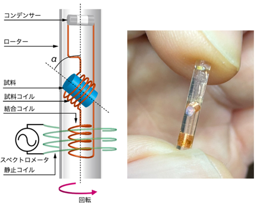 試料と同じ角速度で回転する座標系から核磁気共鳴の信号を観測すれば、バーネット効果は見えるはずだ。高速回転可能なローターに共振回路を組み、遠心力で破壊されないよう樹脂に埋め込んだ独自装置を作成。磁場中で高速回転させると、バーネット磁場に対応した周波数のシフトが観測できた。